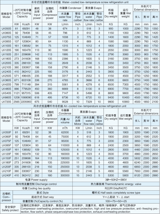 LK 系列低温螺杆冷冻机组是针对钢铁、医药、电子、化工、食品等特殊行业,根据多年工业用冷冻机组设计经验,综合国内外先进技术精心设计研发的低温冷冻设备,其温度范围可在 -30℃ -0℃之间任意调节,压缩机优选采用进口品牌的新型螺杆压缩机。系统零部件及电气控制元件均优选采用进口品牌,性能稳定可靠,控制系统采用 PLC 触摸屏控制,使操作更为简便。可根据客户需求订制各种使用工况的冷冻设备。
