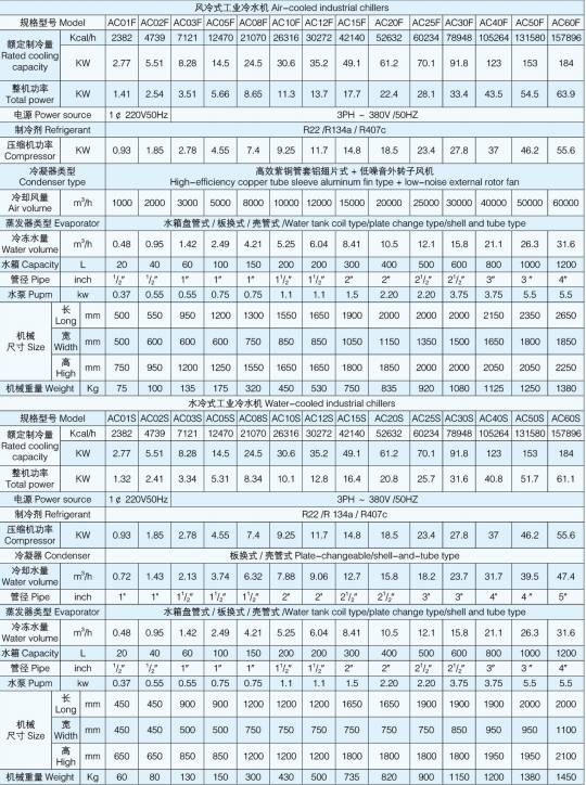 AC系列工业冷水机具有体积小、安装使用方便、在室内可任意移动等特点。压缩机、水泵、温控表、压力控制等优选使用全球知名品牌产品,可靠性高,噪声低。蒸发器采用纯钛金属或不锈钢材质制成,耐腐蚀、抗冻、这类机型被广泛地用于扫描电镜、原子吸收、ICP、激光器、真空镀模机、离子刻蚀机、氧氮分析仪、衍射仪、荧光光谱仪等科学仪器中,以及电子制造、焊接机器人、氦气压缩机、真空炉、反应釜、医药化工、食品饮料、 超声波、印刷医疗仪器、机床设备及液压系统等等各种工业冷却领域中。