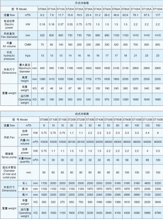 ST系列闭式水塔采用两级方式冷却,一级冷却采用风冷,依靠风对冷却器盘管进行冷却;二级冷却采用风冷和喷淋,在环境温度比较高时使用二级冷却,在风冷的同时喷淋系统将水淋到冷却器表面上,在水蒸发时能够带走盘管的热量,通过顶部的风机把湿热空气经脱水器回收后排出机外,从而达到冷却效果。环境温度比较低时,采用一级冷却。喷淋水的消耗量也仅为单位流量 0.1 - 0.2‰。ST系列闭式循环冷却塔 ( 蒸发式冷凝器 ) 作为热处理行业的主要辅助设备,已广泛运用于热处理淬火介质、可控气氛多用炉、感应加热炉、真空炉等等;同时也广泛适用于中央空调、锻造、铸造、化工、食品、注塑、印刷、发电机组、电厂、玻璃熔窑等领域。