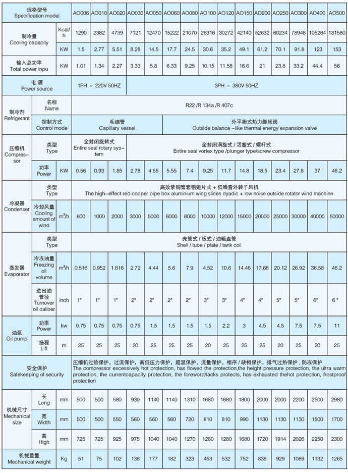AO 系列工业冷油机适用于数控机床、座标镗床、磨床、加工中心、组合机床及各种精密机床的主轴润滑油和液压传动油的冷却,能精确的控制油温,有效减少机床的热变形,提高机床的加工精度。还常用于脉冲试验台、爆破实验台、气密性试验台、制动管和动力转向管保压台、耐压试验台、真空试验台、制动软管挠曲疲劳试验台、阀门试验台、液压阀试验台、液压泵试验台、液压马达试验台、液压油缸出厂试验台等一系列工业检测设备的油冷却系统。同时还在车床、高速车床、内外径研磨机、放电加工机、油压机械、磨床、拉床、铣床、综合加工中心机、木工雕刻机、切削机械等工业设备加工行业得到了广泛应用。