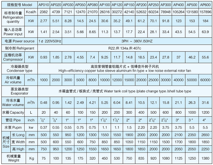 AP 系列机床工业冷水机主要用于各种数控机床所需要的制冷设备,产品压缩机,水泵,电器元件等均选用国际知名品牌,高效率,低耗能,低噪音等特点,能够满足机床生产过程中的各项要求,是机床工业生产的理想辅助设备。