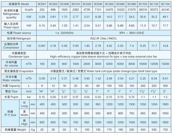 SC 系列小型冷水机具有体积小、安装使用方便、在室内可任意移动等特点,因压缩机、水泵、温控表、压力控制等使用的是优选进口产品,所以性能良好,噪声低。蒸发器一般采用不锈钢盘管制成,耐腐蚀、抗冻、这类机型被广泛地用于激光器、3D 打印机,真空镀模机、离子刻蚀机、氧氮分析仪、衍射仪、荧光光谱仪等分析仪器中,以及医疗仪器、机床设备及液压系统中。